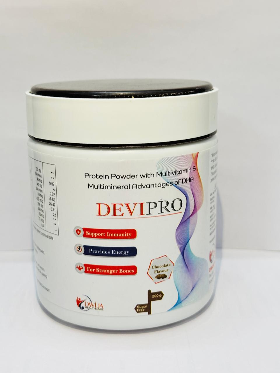 Boost your daily nutrition with DEVIPRO Protein Powder, enriched with multivitamins, multiminerals, and DHA. Designed to support immunity, provide lasting energy, and strengthen bones, this delicious chocolate-flavoured supplement is ideal for overall health and wellness.