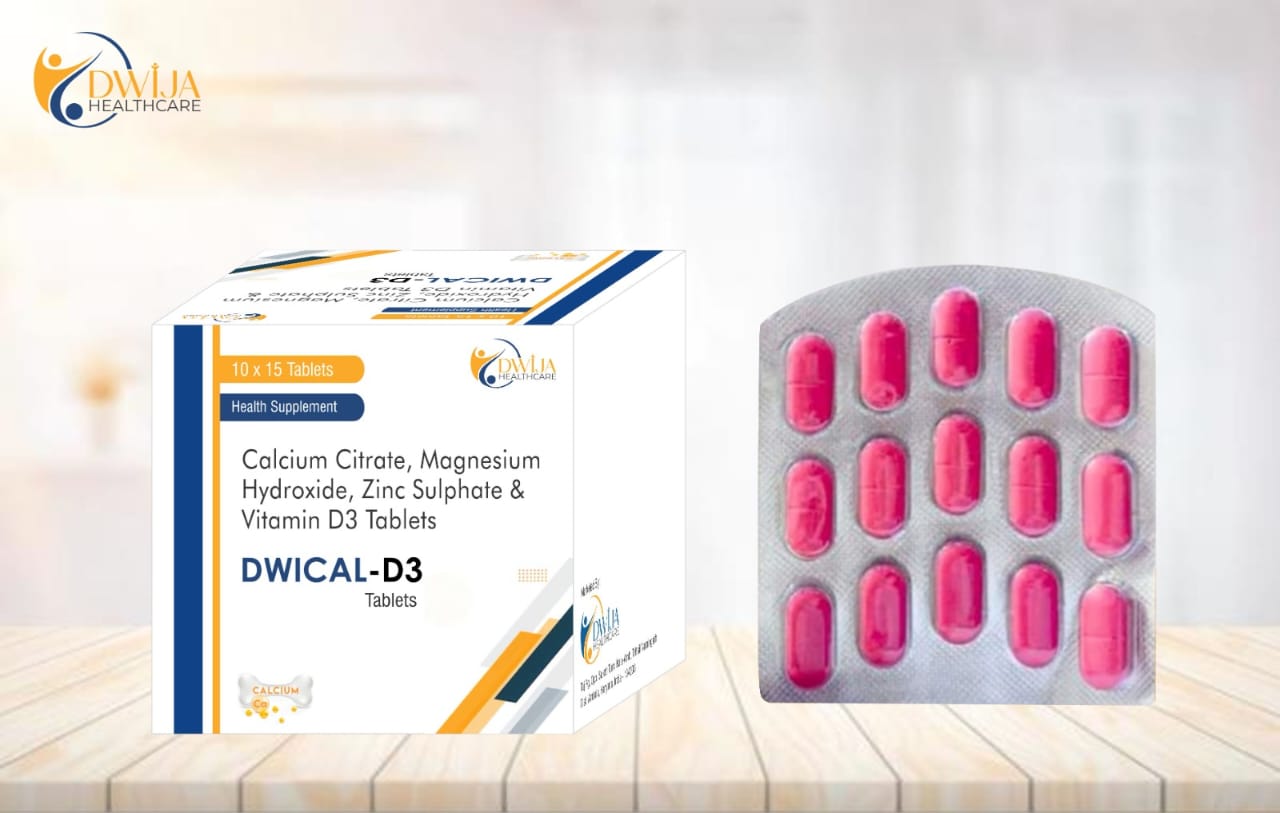 DWICAL-D3 Tablets are a premium health supplement designed to support strong bones, teeth, and overall wellness. Each tablet contains a balanced blend of Calcium Citrate, Magnesium Hydroxide, Zinc Sulphate, and Vitamin D3, making it a complete formulation for maintaining bone density and improving mineral absorption in the body.