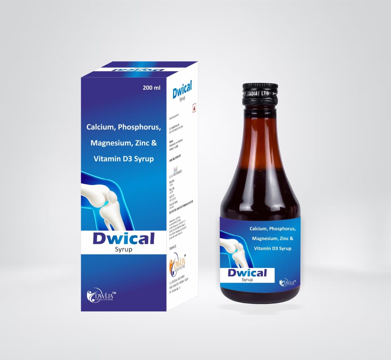 Dwical Syrup is a health supplement specially formulated with Calcium, Phosphorus, Magnesium, Zinc, and Vitamin D3 to support strong bones, healthy teeth, and overall vitality. It helps in maintaining essential mineral balance in the body, making it an ideal choice for growing children, adults, and elderly individuals with increased nutritional needs.