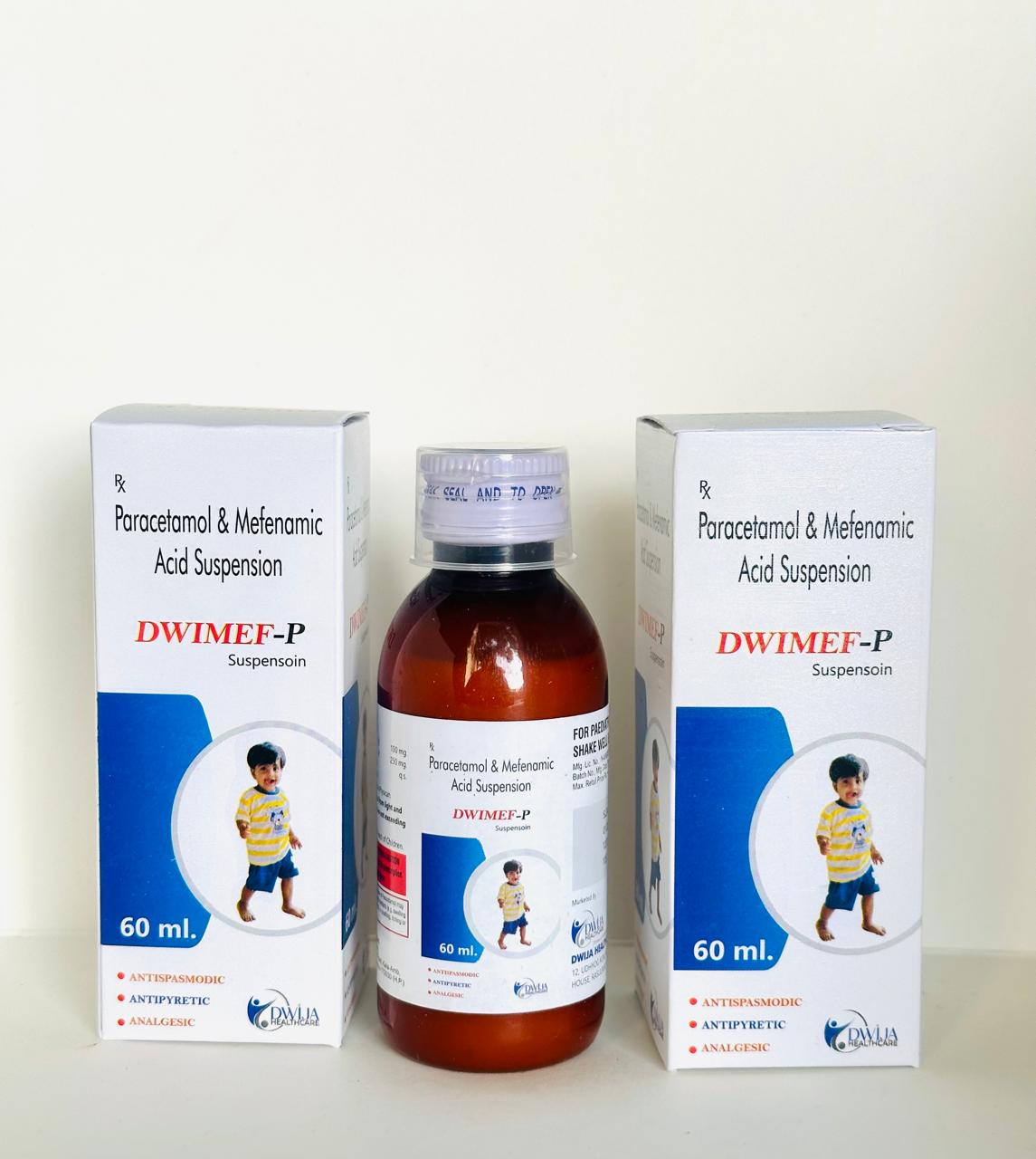 DWIMEF-P Suspension combines Paracetamol and Mefenamic Acid for relief from pain, fever, and spasms.